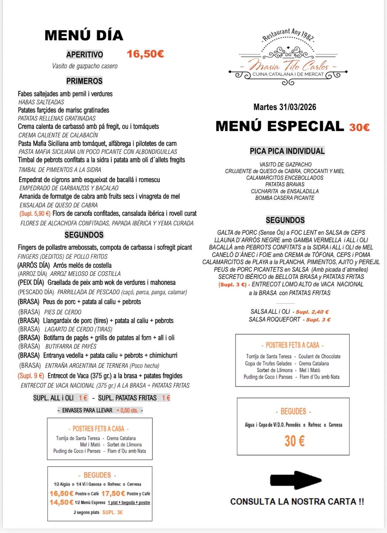 Con mucho trabajo, dedicación y cariño por el oficio, Eva y Daniel han conseguido especializar a la Masía Tito Carlos en una cocina catalana de mercado y sobretodo de temporada, apostando siempre por el producto tradicional, de calidad y cercanía, junto con un servicio siempre familiar, atento y profesional.